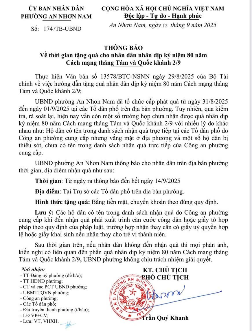 UBND phường An Nhơn Nam thông báo về thời gian tặng quà cho nhân dân nhân dịp kỷ niệm 80 năm Cách mạng tháng Tám và Quốc khánh 2/9