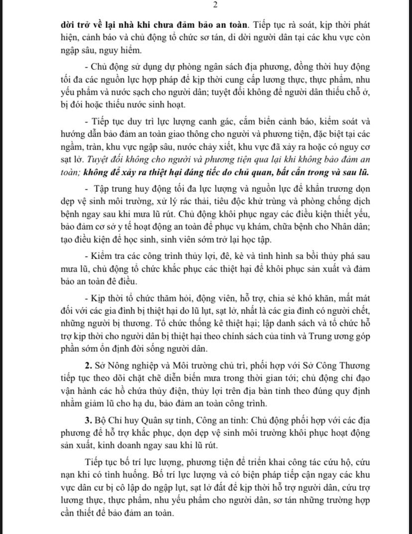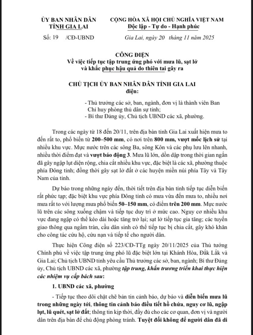 Thứ năm, 20/11/2025 | 20:00 A- A A+ | Công điện của Chủ tịch UBND tỉnh về việc tiếp tục tập trung ứng phó với mưa lũ, sạt lở và khắc phục hậu quả do thiên tai gây ra Chia sẻ Đọc bài Lưu Công điện của Chủ tịch UBND tỉnh ngày 20/11/2025 về việc tiếp tục tập trung ứng phó với mưa lũ, sạt lở và khắc phục hậu quả do thiên tai gây ra.